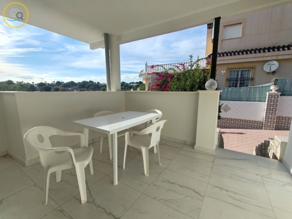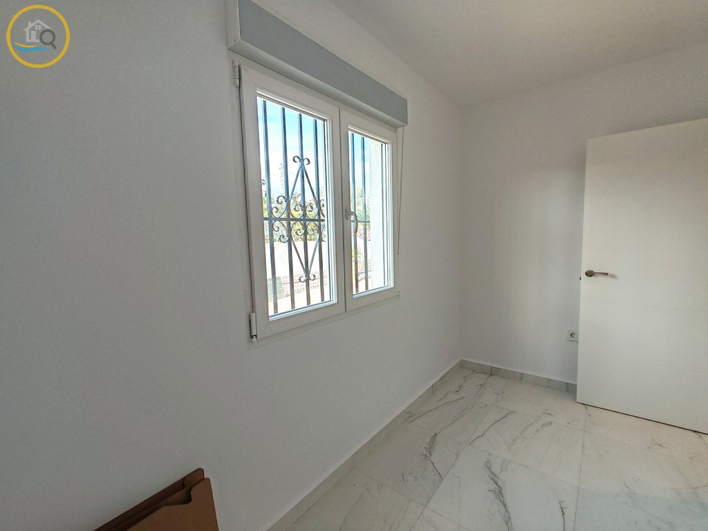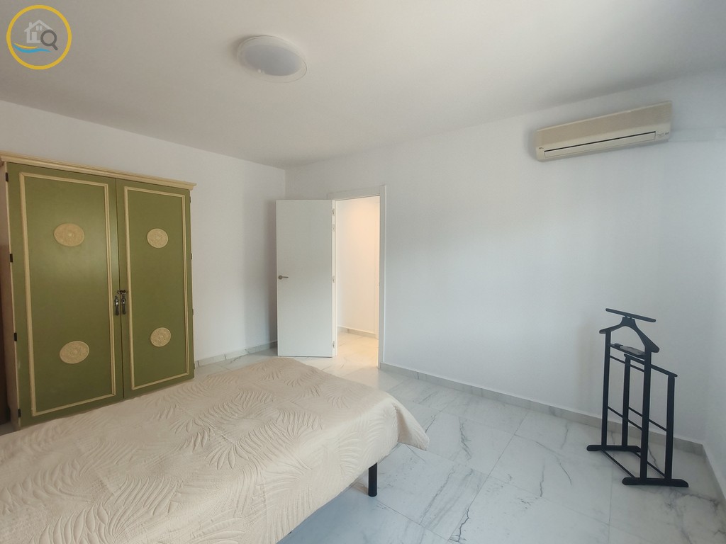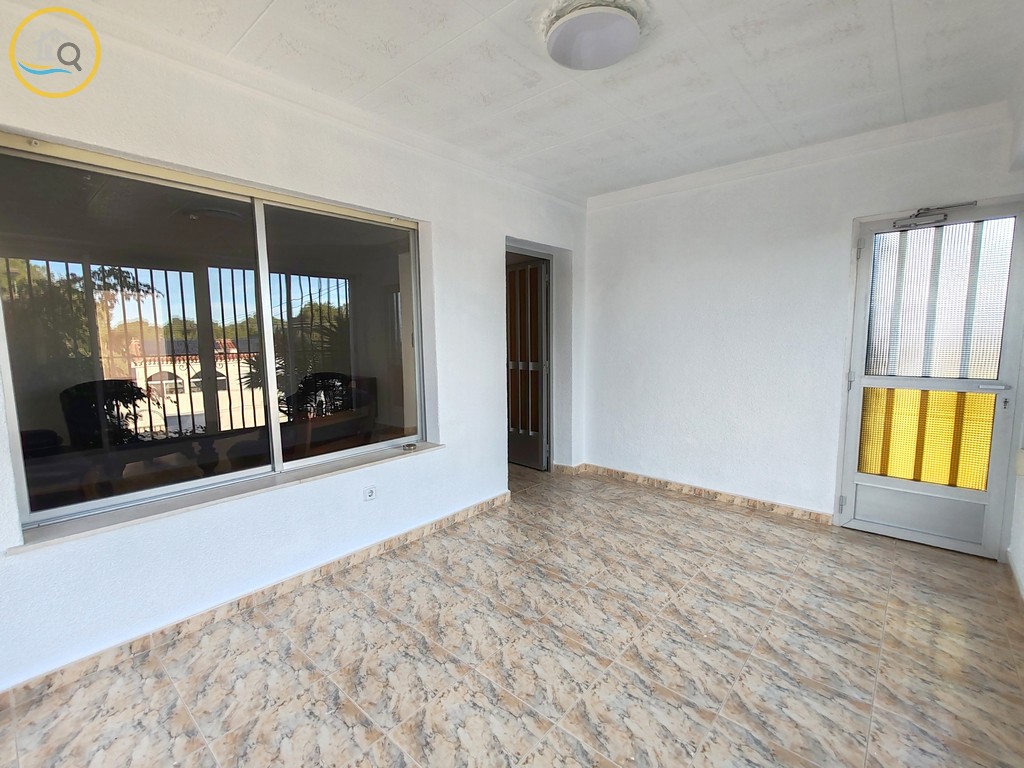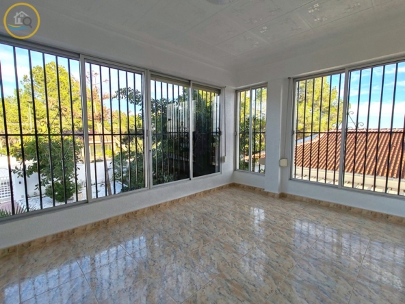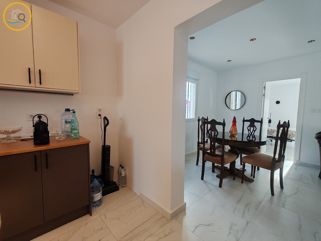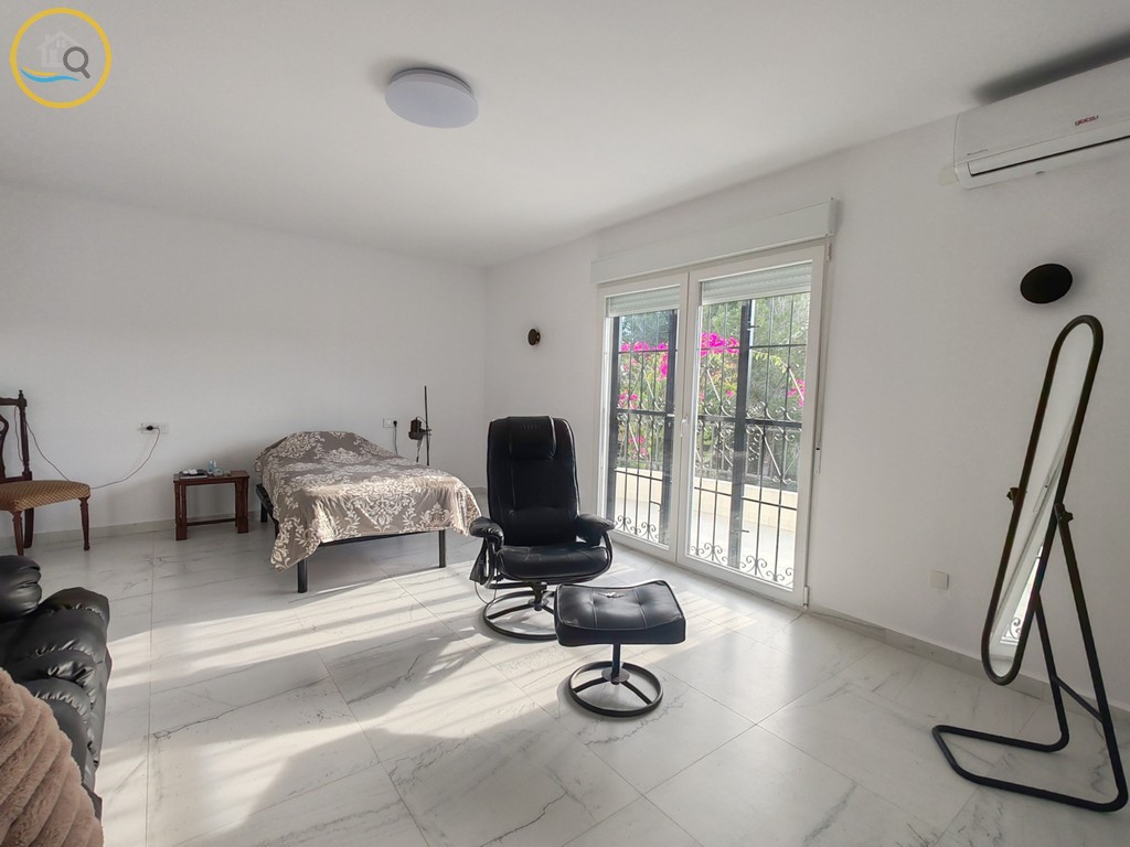 This plot has off street parking with space for several cars. The villa is currently separated into two separate spaces on the ground floor accessed via a glass door which opens into a spacious and bright open plan newly installed kitchen with a large central island and a dining room. To the right of the kitchen is a hallway which leads to a large bedroom a family bathroom and a smaller box room which could be used as an office or dressing room. To the rear of the kitchen is a good size living room a door from the living area which leads out to a covered terrace. A second door in the living room takes you to a large master bedroom with private balcony.