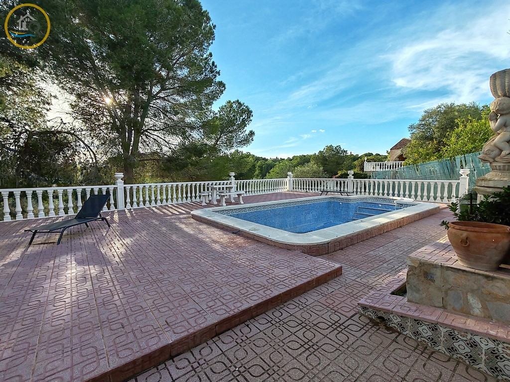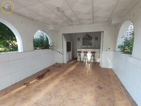 A set of external stairs from the front of the villa lead to the second half of the living space consists of a glazed room, a spacious living room, large separate fully fitted kitchen, family bathroom, double bedroom and a box bedroom. At the rear of the property is another large master bedroom with patio doors onto the terrace there is also a second door leading to another terrace with sun awnings.This property offers a storage room and what was a garage which was used as a summer kitchen, this area offers electric and water connections. You will find steps at the side of the villa that will take you down to the pool area and terrace that backs onto the green area, there is an outside bar with BBQ. This property is sold furnished.