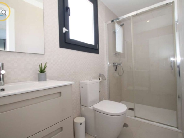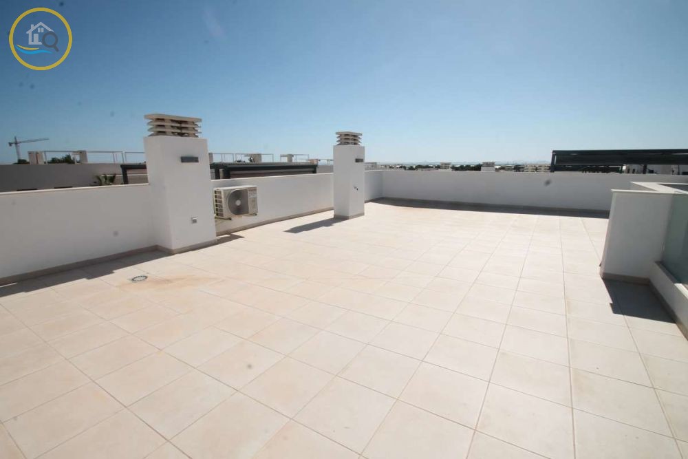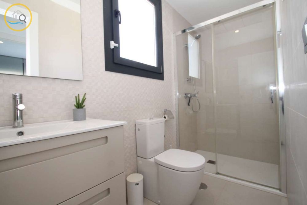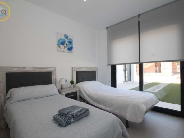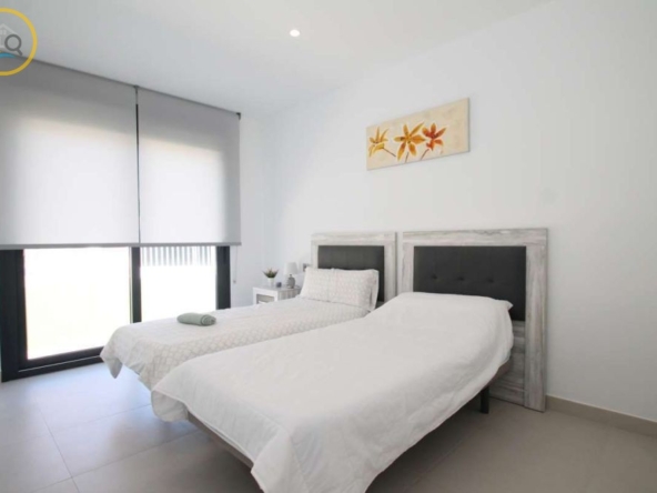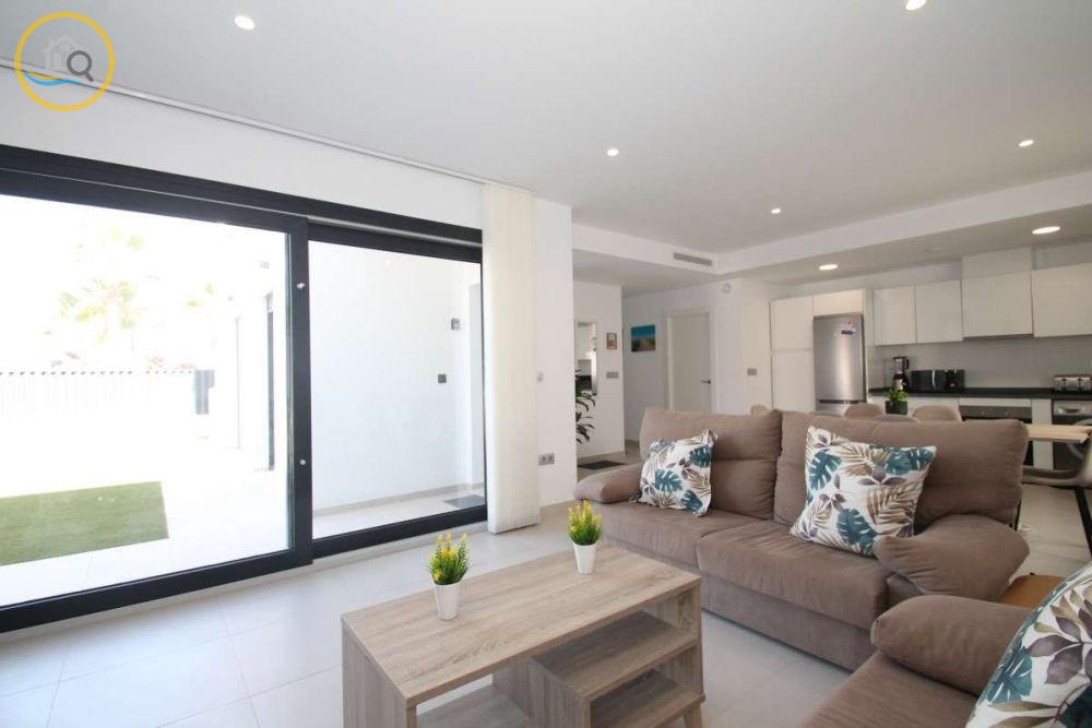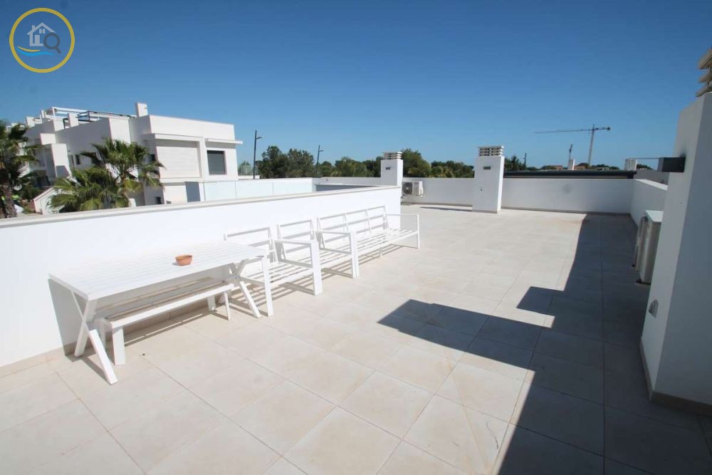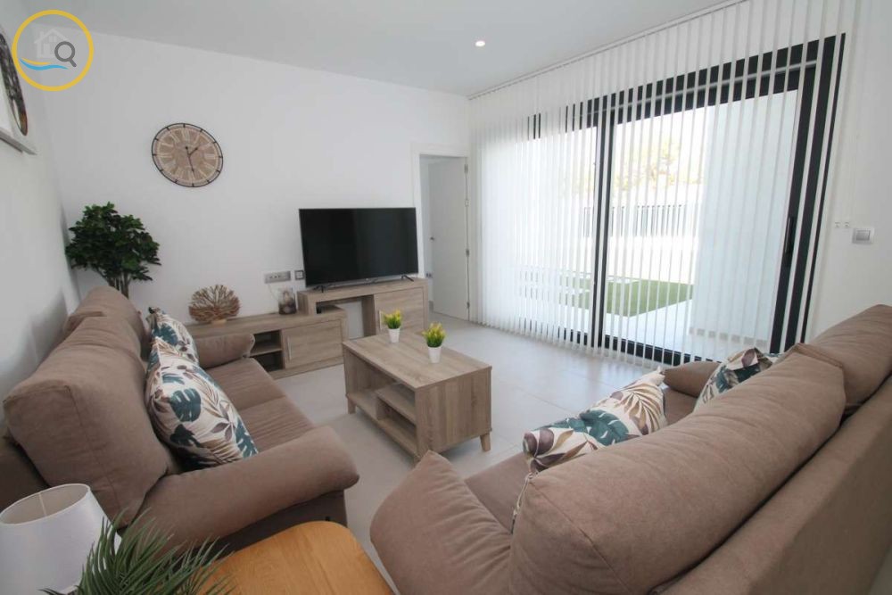 Modern villa for sale in Lo Romero Golf, Pilar de la Horadada, with a built area of 81 m² on a private plot of 249 m². The property has three bedrooms, three full bathrooms, a storage room, and a garden, all distributed on a single floor. this modern property offers a large solarium with lovely views from the roof top, and also a commual pool area, as well as private parking . It is located within a gated community with 24-hour security, offering maximum security and tranquility. It is in excellent condition and is sold fully furnished, with air conditioning, appliances, and built-in wardrobes included. Ideal for those seeking comfort, privacy, and a privileged location next to · “Lo Romero the golf course.”.